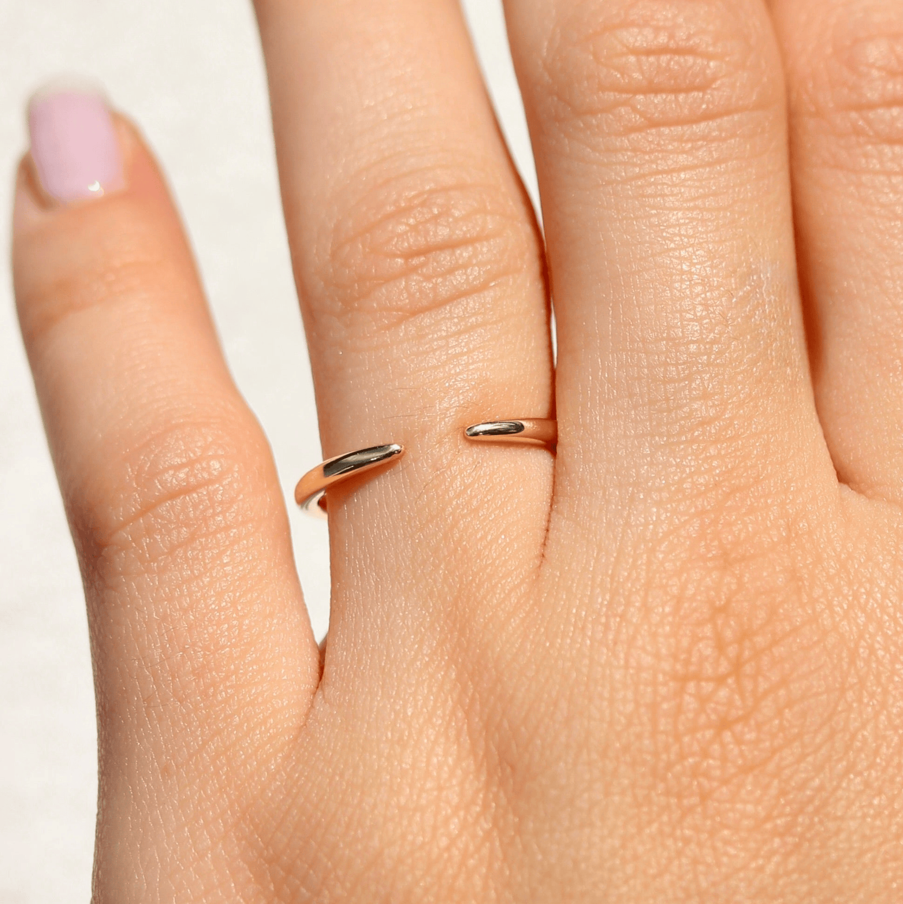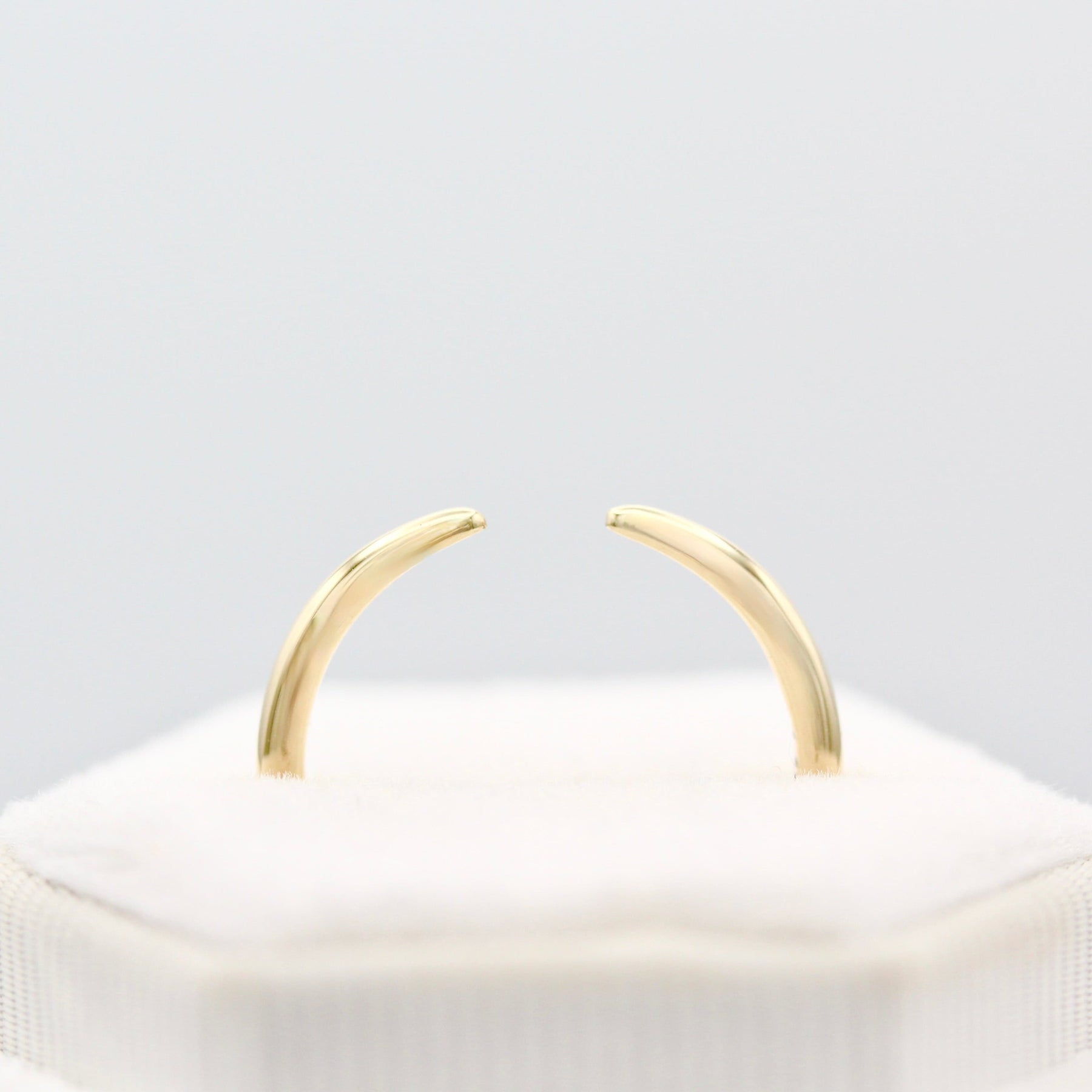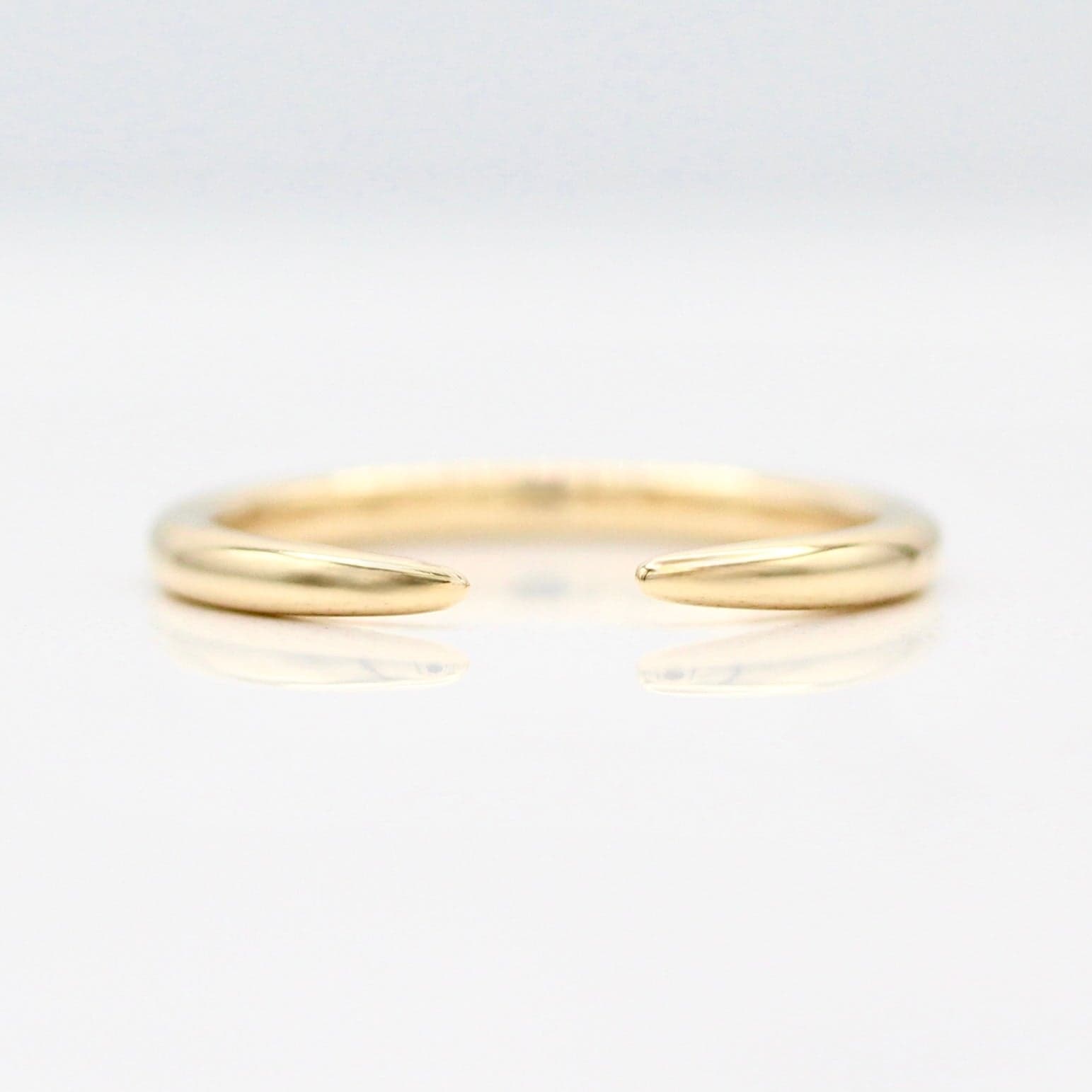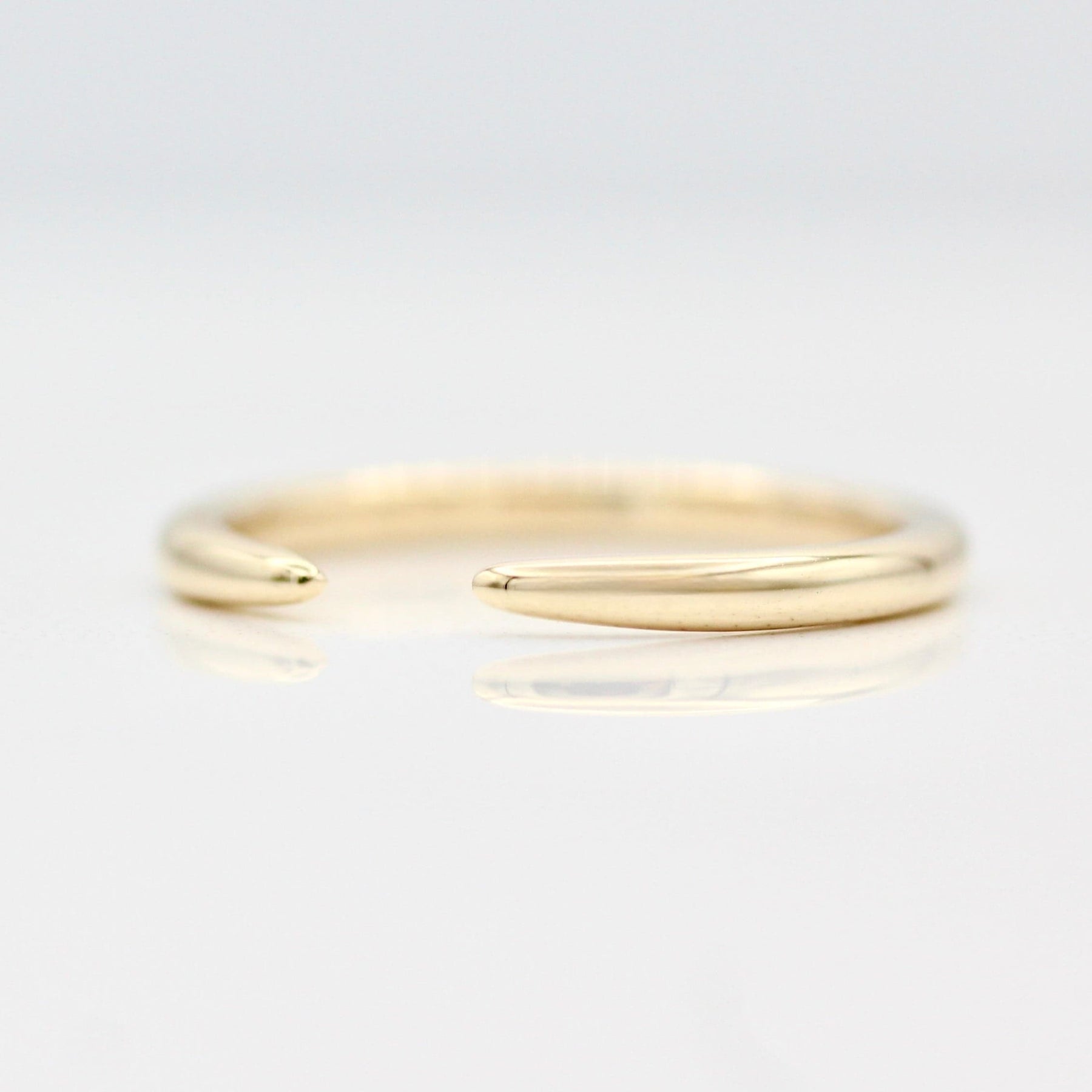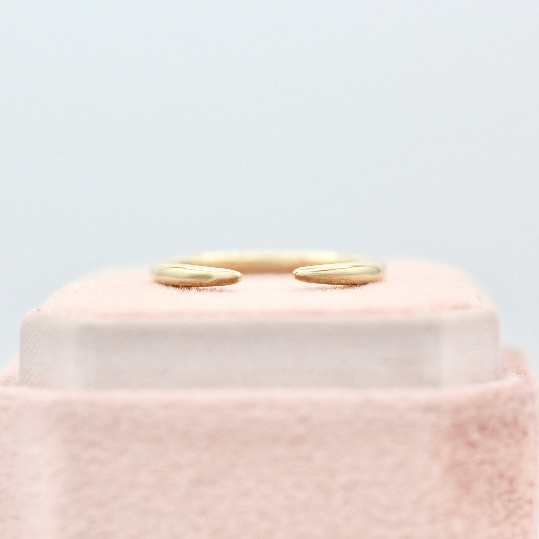 The Luna Open Wedding Band is a dainty open band that tapers at the center. It accommodates many engagement rings, and can also be worn alone for a cool, modern look.