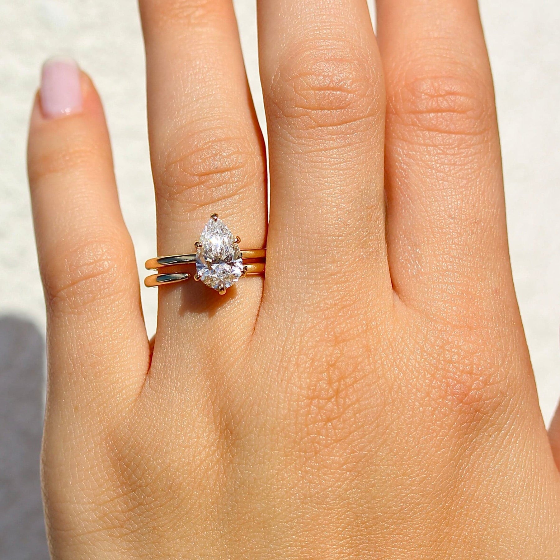 The Luna Open Wedding Band is stacked with the Paige Hidden Halo Engagement Ring.